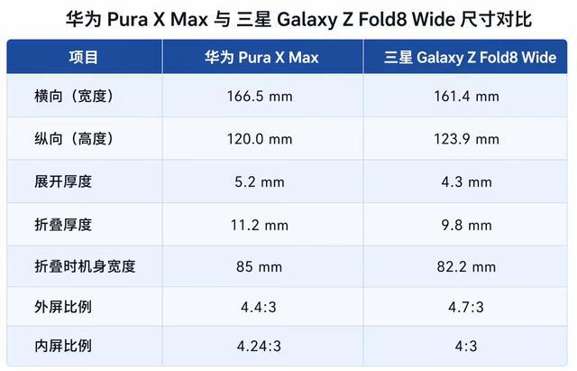 华为 Pura X Max 展开尺寸为 120 x 166.5 x 5.2 mm,折叠尺寸为 120 x 85 x 11.2 mm。内屏 4.24:3 比例,外屏 4.4:3 比例。